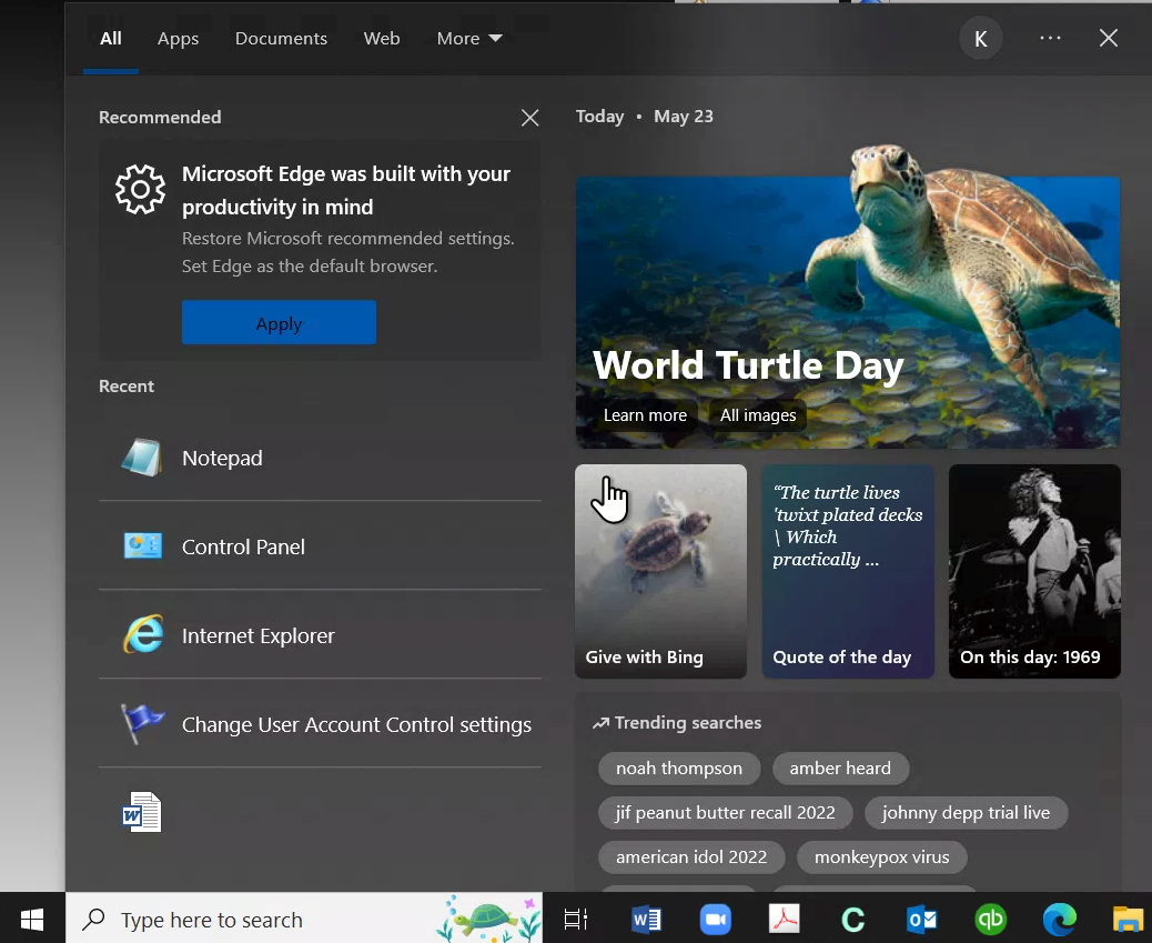 Windows 10 Searchbar Turtle Day May 24, 2022Full resolution (1038 × 849) ← Previous Next → Windows 10 Searchbar Turtle Day